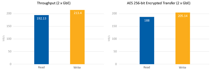 O storage possui criptografia acelerada por hardware Intel AES-NI, entregando até 205.14MB/s com criptografia AES 256 bits para volume completo e pastas compartilhadas, aumentando segurança do sistema e dos arquivos armazenados.