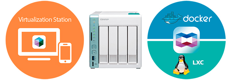 O NAS também oferece tecnologia para virtualização de servidores. O Qnap Container Station é uma tecnologia exclusiva que integra tecnologias de virtualização LXC e Docker, que permite operar múltiplos sistemas isolados Linux no storage Qnap, bem como baixar aplicativos a partir do Docker Hub Registry.