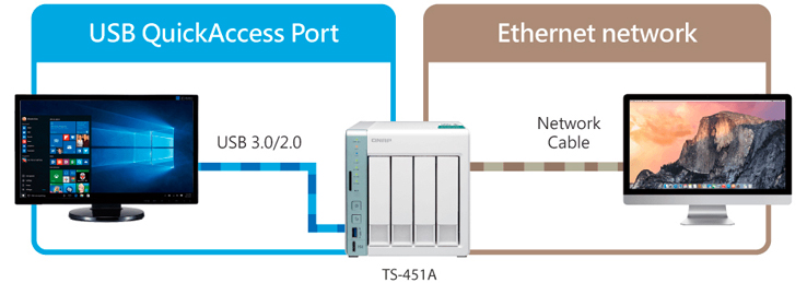 O usuário pode acessar instantaneamente arquivos e dados armazenados no NAS TS-451A conectando um PC/Mac a uma porta USB QuickAccess e usando o aplicativo QFinder Pro.