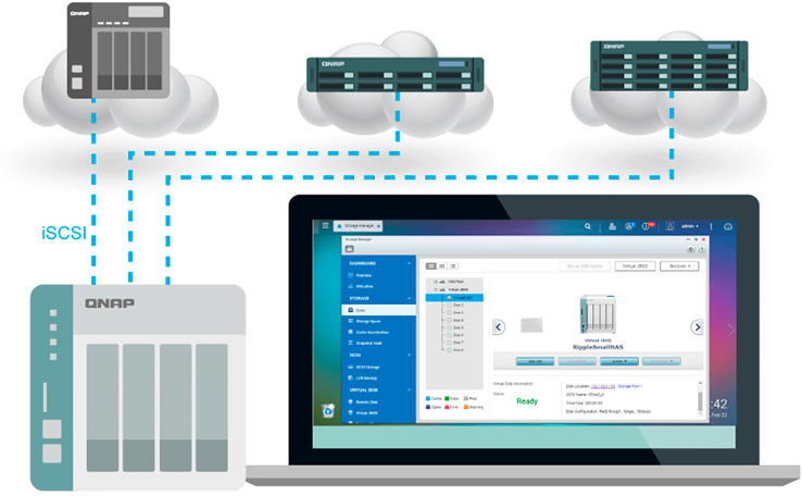 Além dos gabinetes de expansão, O VJBOD (JBOD Virtual) expande o armazenamento do TS-451A através de outros NAS Qnap que estejam conectados a rede e possuam área livre.