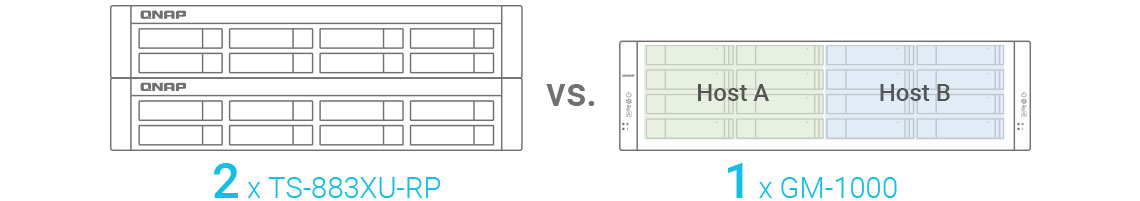 O NAS duplo GM-1000 é um chassi 3U com 16 compartimentos de unidade de 3,5 polegadas. Comparado à implantação de 2 sistemas NAS de montagem em rack 2U de 8 baias, o GM-1000 economiza espaço no rack e reduz os custos de sistema.