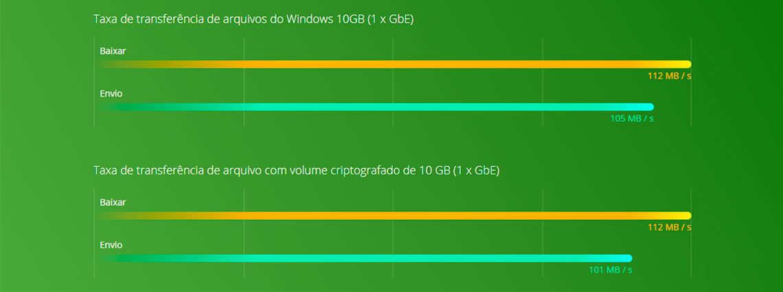 Caso você decida criptografar seus arquivos utilizando o AES-256, o desempenho ainda será alto, chegando a 112MB/s, o que permite garantir a sua privacidade sem sacrificar o desempenho.