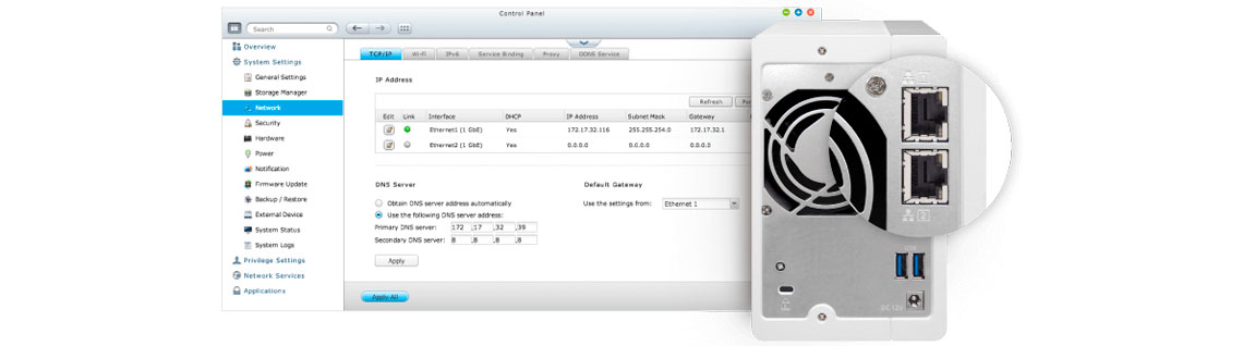 O TS-231P Qnap suporta vários modos de porta de trunking, permitindo aos administradores configurar agregação de links para aumentar o total potencial de transmissão de dados. Failover e IP duplo são suportados para garantir operações contínuas do sistema. Os modos port-trunking suportados incluem: Balance-rr (Round-Robin), Active Backup, Balance XOR, Broadcast, IEEE 802.3ad, Balance-tlb (Adaptive Transmit Load Balancing) e Balance-alb (Adaptive Load Balancing).