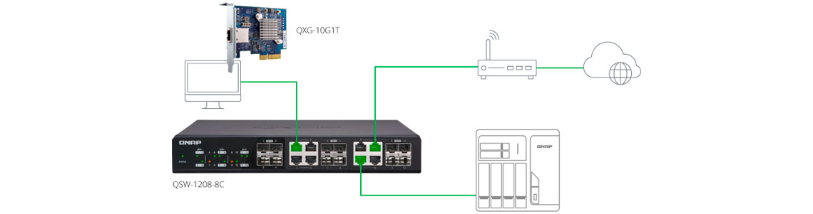 Os switches não gerenciados da Qnap 10GbE/NBASE-T permitem que você atualize instantaneamente seu ambiente de rede. Com uma rede de 10GbE, você pode alcançar velocidades de transferências extremamente rápidas, capacitar tarefas que exigem banda larga, como a virtualização e permitir acesso simultâneo e em tempo real a grandes arquivos baseados em NAS usando várias estações de trabalho, o que é ideal para realizar tarefas de edição de vídeo e multimídia.