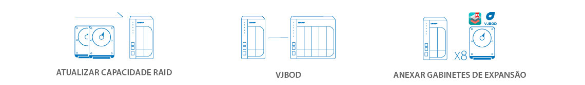 Para atualizar a capacidade RAID você pode realizar o hot-swapp de uma unidade de menor capacidade por uma de maior capacidade. Utilize o VJBOD (Virtual JBOD) para expandir sua capacidade de armazenamento usando o armazenamento não utilizado de outro Qnap NAS.