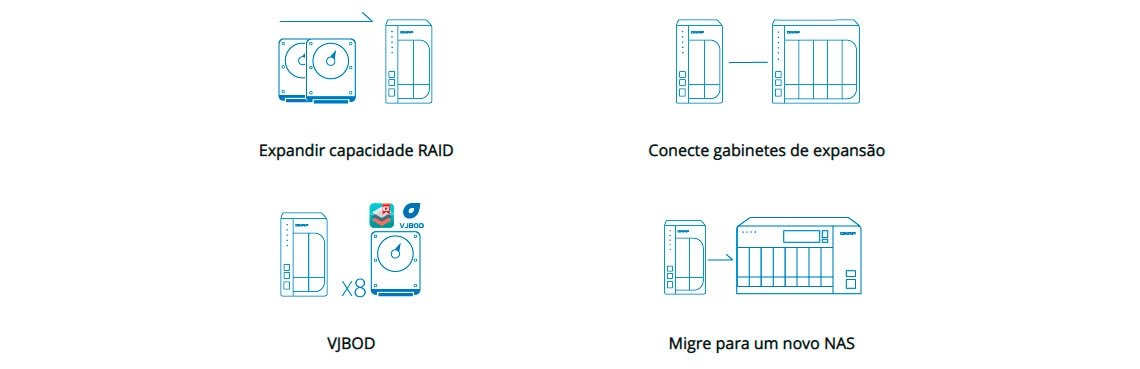 Até oito NAS Qnap podem ser utilizados como discos locais no NAS doméstico 2 baias. Migração para novo NAS Os discos podem ser instalados em outro NAS de maior capacidade, mantendo os dados e configurações existentes.