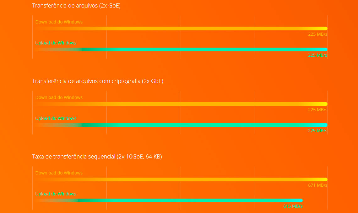 O processador Intel Celeron Quad Core de 1,5GHz, 2GB ou 4GB de RAM DDR3L (expansível até 8GB) e duas portas LAN Gigabit oferecem um desempenho de até 225MB/s de velocidade de leitura/gravação.