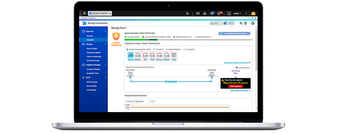 Os snapshots da Qnap são baseados em bloco e só gravam os dados alterados, isso não só economiza espaço de armazenamento, mas reduz o tempo para fazer backup e restauração de dados. O TS-253Be Qnap suporta até 1024 snapshots por NAS e até 256 snapshots por volume ou LUN.