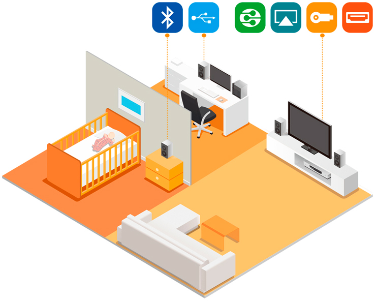 O TS-431p gerencia e transmite fotos, músicas e vídeos para diferentes ambientes de um único dispositivo usando dispositivos Bluetooth e USB (somente streaming de música), via DLNA, Apple TV e Chromecast.