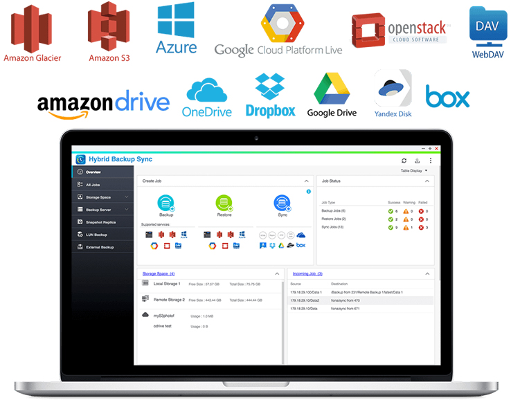 O Hybrid Backup Sync consolida funções de backup, restauração e sincronização (usando RTRR, rsync, FTP, CIFS/SMB) num único aplicativo, transferindo dados para ambientes locais ou remotos ou armazenamento em nuvem, como plano para recuperação de dados.