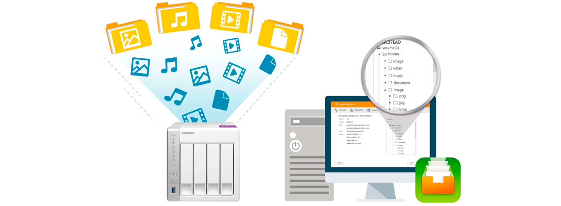 O aplicativo Qfiling ajuda a automatizar a organização de arquivos salvos no TS-431P2, ao distribuir dados de forma inteligente por várias pastas. Isso reduz o tempo necessário para organizar e localizar arquivos importantes, categorizando arquivos e determinando as condições de arquivamento.