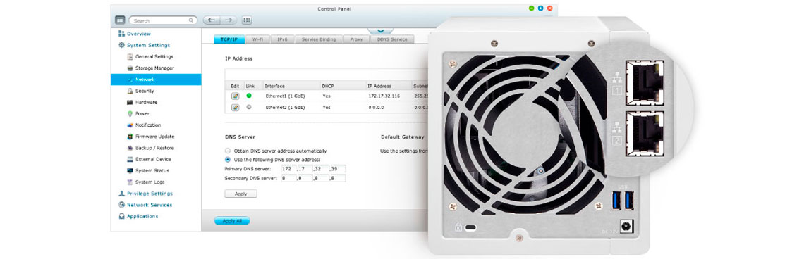 O TS-431P2 suporta vários modos de agregação de link, incluindo, Balance-rr (Round-Robin), Active Backup, Balance XOR, Broadcast, IEEE 802.3ad, Balance-tlb (Adaptive Transmit Load Balancing) e Balance-alb (Adaptive Load Balancing).
