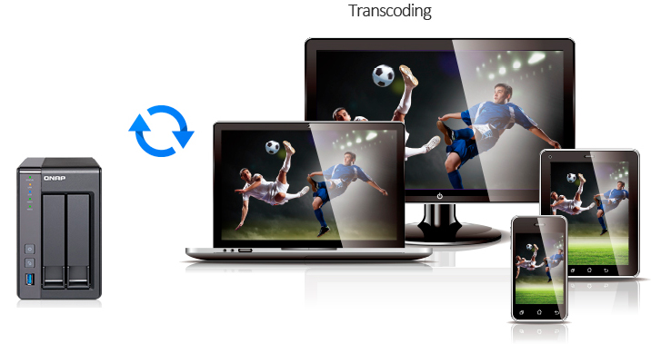 O NAS 2 baias Qnap oferece transcodificação de vídeo Full HD em tempo real, convertendo para formatos compatíveis para reprodução em PCs, dispositivos móveis e Smart TVs. Permite vários dispositivos diferentes visualizar vídeos armazenados no TS-251+ simultaneamente com transcodificação acelerada, economizando tempo na conversão em diferentes formatos. Através da transcodificação off-line é possível reproduzir vídeos através do app File Statiom, Video Station ou QFile selecionando um vídeo de baixa resolução pré-renderizados, economizando recursos do sistema do storage para outras aplicações, além de definir uma pasta dedicada para transcodificação de vídeo automática.