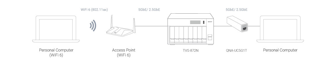 À medida em que os notebooks e pontos de acesso passaram a suportar o padrão Wi-Fi 6 (802. 11ax), a banda larga sem fio pôde aumentar para 5GbE/2.5GbE, proporcionando agora velocidades muito mais rápidas do que as conexões Gigabit convencionais. Para aprimorar seu ambiente de rede e o armazenamento, invista no TVS-682N.