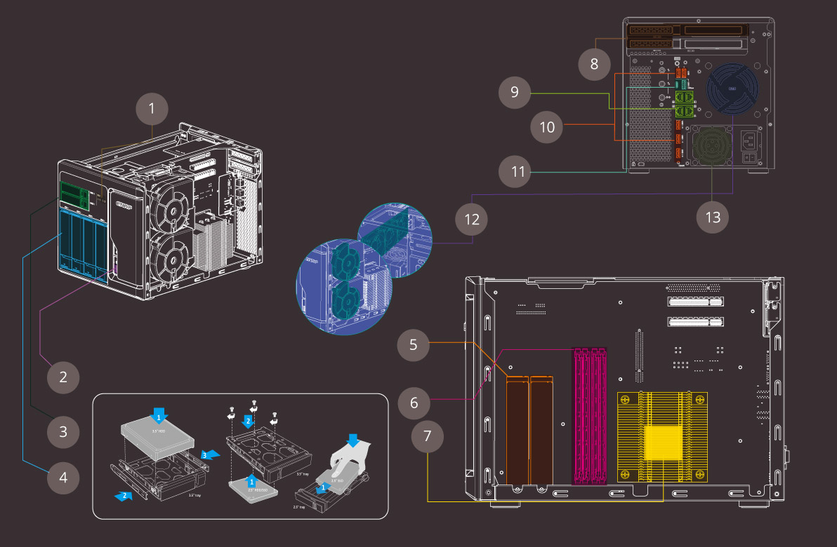 Com duas gavetas para drives SSD de 2,5 polegadas, dedicadas para aumentar a performance de IOPS, com a opção de suporte adicional de chips M2. SATA 6GB/s, o storage se torna muito mais rápido e eficiente, sendo capaz de lidar com operações de fluxo IOPS variável, como virtualização.