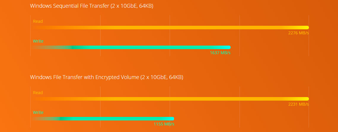 Alimentado com processador de 8ª geração Intel Core i3-8100 Quad-Core 3,6GHz, até 64GB máxima de memória DDR4, 4 portas gigabit e 2 portas LAN 10GbE SFP+, o TVS-1672XU-RP oferece uma alta velocidade de transferência até 2276MB/s de leitura e até 1637MB/s de gravação. Com criptografia AES-NI fornece velocidades até 2231MB/s de leitura e 1155MB/s de gravação.