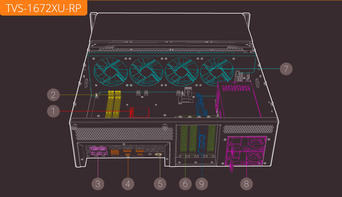 O TVS-1672XU-RP oferece 4 slots PCIe que permitem o uso de várias placas de expansão das funcionalidades NAS do sistema.