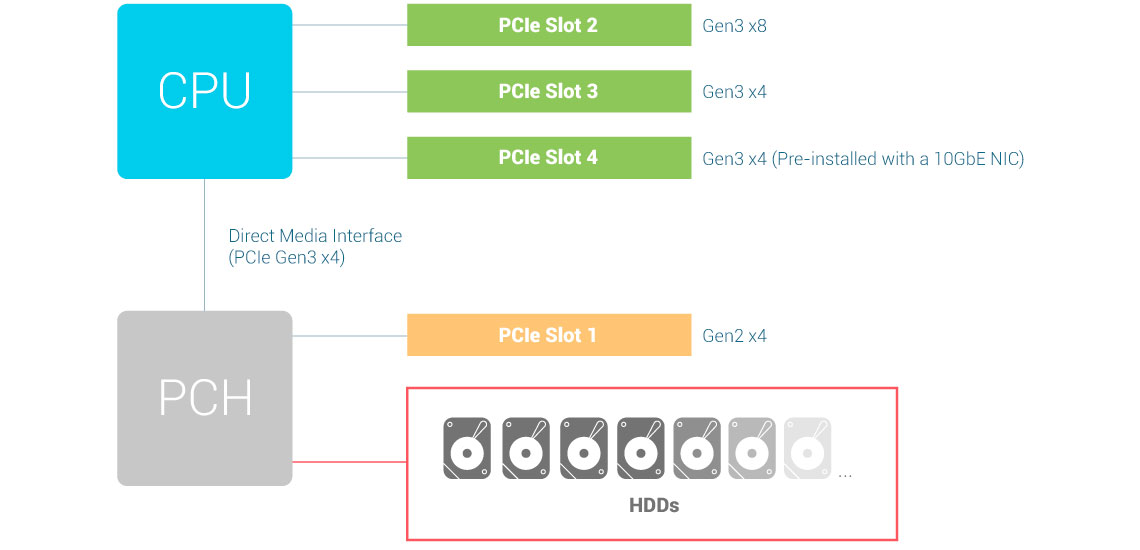 O servidor oferece uma instalação de adaptadores de 40GbE / 25GbE / 10GbE para aumentar o desempenho da aplicação. O slot PCIe disponível permite a instalação de placas gráficas que capacitam fluxo de trabalho de IA e transcodificação de vídeo, além disso, é possível exibir vídeos de vigilância em monitor ou TV via HDMI para melhorar o gerenciamento de monitoramento.