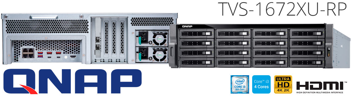 O Qnap TVS-1672XU-RP oferece 16 baias hot-swappable e fonte de alimentação redundante. Equipado com processador Intel Core i3 Quad-Core, 8GB de memória RAM, 4 portas LAN gigabit, 2 portas 10GbE SFP+ com suporte a iSER que aceleram o compartilhamento de arquivos, 1 porta HDMI e 4 slots PCIe para instalação de placas adicionais, solução de armazenamento rackmount ideal para uso intensivo de compartilhamento de arquivos, backups carregados ou aplicativos de virtualização.