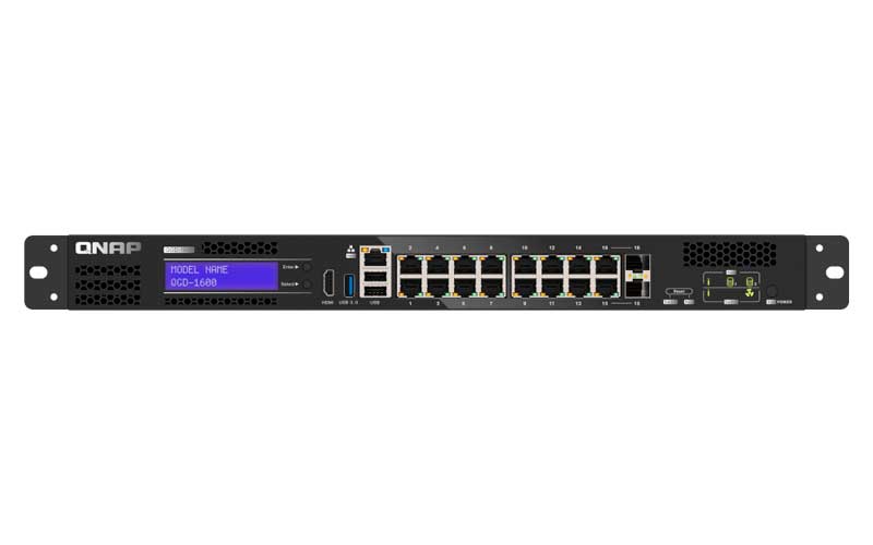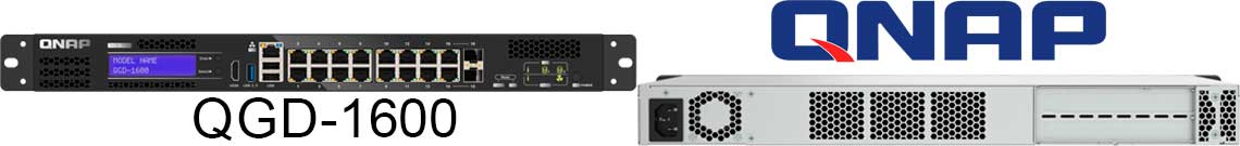 O QGD-1600 é um switch de 16 portas combinadas, sendo 14x conexões Gigabit RJ45 e 2x Gigabit RJ45/SFP, além de incluir rede de camadas, sistema operacional QTS, interface de gestão, aplicações de virtualização, além de recursos como: uma rede definida por software (SDN), que lhe permite funcionar como NAS, NVR, router e firewall para vigilância IP, segurança de rede e expansão de armazenamento.