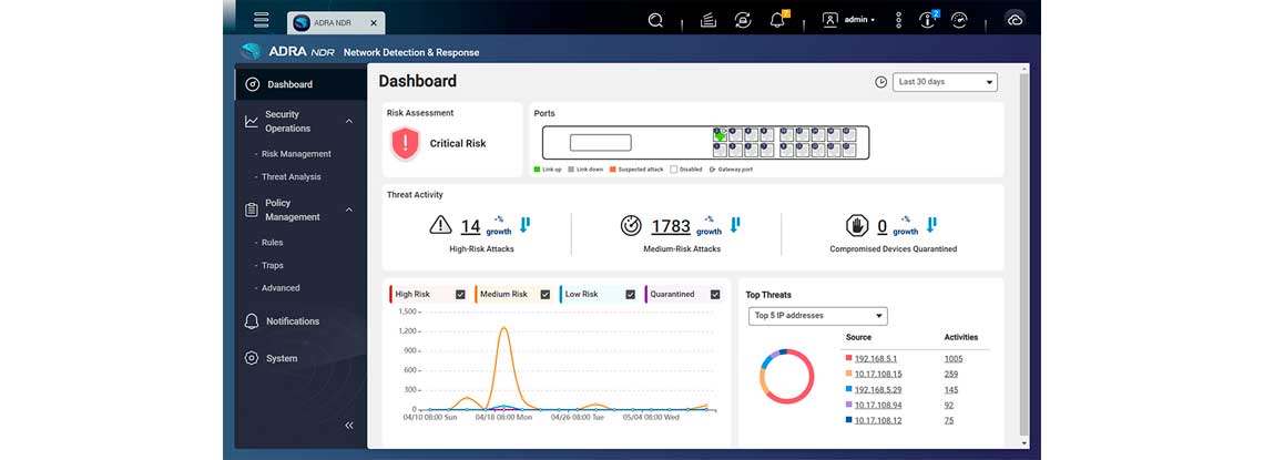 O NDR ADRA dispõe de um painel de visualização rápida e de uma interface gráfica de gestão de fácil utilização, que ajuda o pessoal de TI a detectar e analisar rapidamente potenciais ameaças.