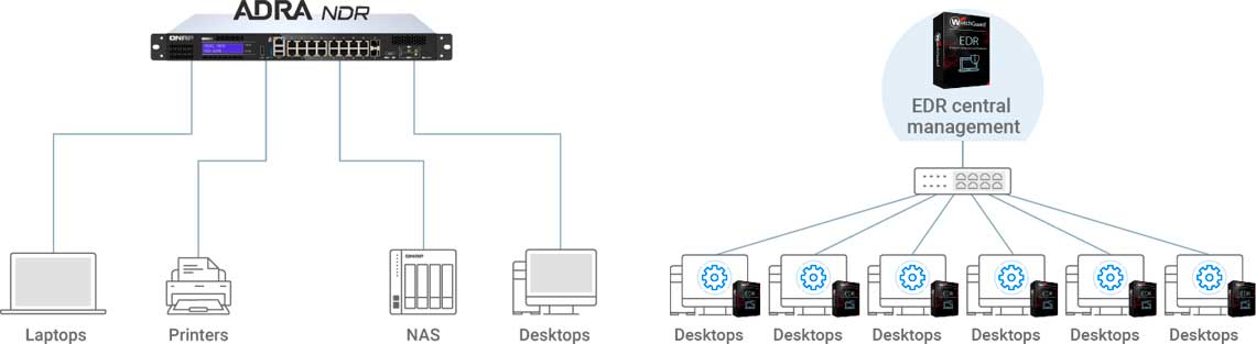 Acessível para PME: As soluções EDR devem ser implementadas em cada dispositivo cliente com licenciamento individual. O NDR ADRA de custo reduzido pode ser implementado no switch de acesso.