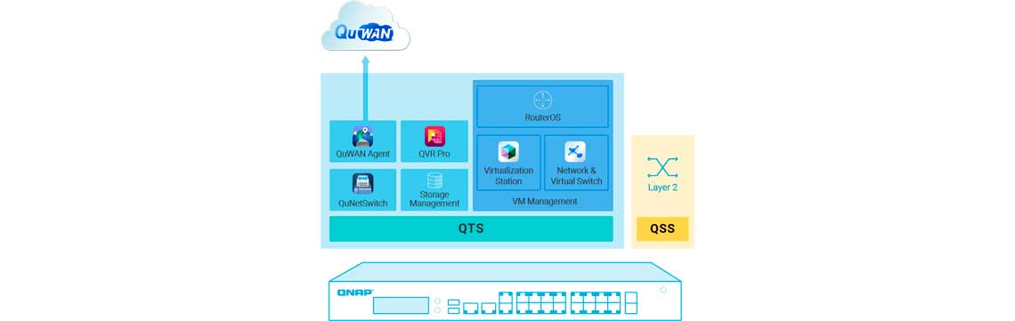 O QTS pode acessar e controlar diretamente os dados processados no QSS usando Virtual Switches. O QGD-1602 fornece largura de banda interna de 20 GbE para acelerar a computação entre dispositivos finais e hosts. As 2x portas adicionais de gerenciamento de host 5GbE e 2x Gigabit também podem ser conectadas a vários hosts para implantar várias máquinas virtuais.