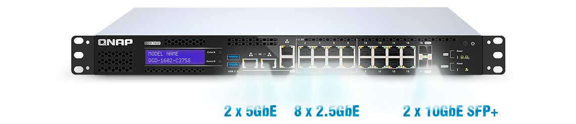 O QGD-1602 Qnap é um switch gerenciável de 18x portas, sendo 8x 2,5 GbE (RJ45), 8x 1GbE (RJ45) e 2x 10GbE SFP+ e atende aplicações de vigilância IP, segurança de rede e expansão de armazenamento, mas também integra QuWAN para formar uma arquitetura SD-WAN com outros dispositivos QNAP em vários locais, ajudando a construir uma infraestrutura segura.