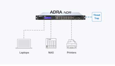 Detecção ativa: O dispositivo ADRA verifica pacotes de rede específicos que passam através do switch procurando atividades suspeitas. Uma Intersecção de ameaças é uma Máquina Virtual que simula vários serviços comuns como um chamariz para o ataque de malware. Uma vez iniciado um ataque, a atividade suspeita pode ser detectada pelo NDR ADRA.
