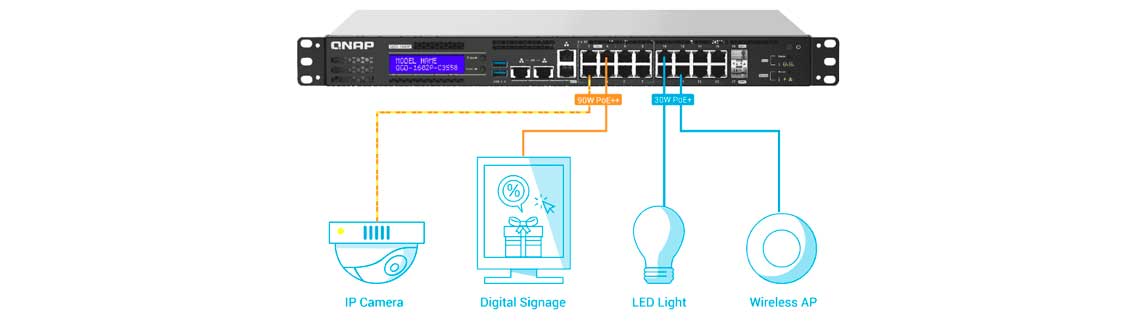 Sistema de Vigilância IP Total: Com 4 portas PoE de 90 watts e 12 portas PoE de 30 watts para câmeras PTZ de alta potência, proporcionando um sistema de vigilância simplificado quando combinado com o QVR Pro.