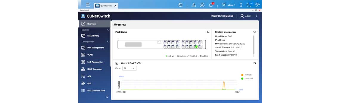O QGD-1602P oferece gerenciamento abrangente de rede de Camada 2 com recursos de VLAN, LACP e mais. Possui funções de segurança poderosas, tornando-o adequado para redes simples. Além do QNAP Switch System (QSS), inclui o software QuNetSwitch via QTS para controle fácil e intuitivo de dispositivos de rede.