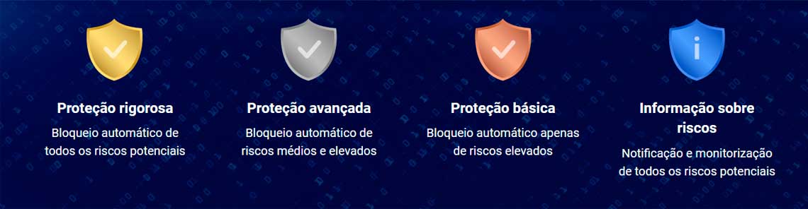 Regras: Uma vez detectadas atividades de malware, são tomadas ações de resposta configuradas com base na regra selecionada, incluindo Proteção Restrita, Proteção Avançada, Proteção Básica e Informação de Risco.