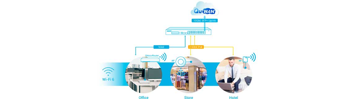 O QGD-1602P oferece 8 portas de 2,5GbE com até 90W de PoE por porta. Pode se conectar a um roteador QHora Wi-Fi 6 para redes Wi-Fi 6 em ambientes domésticos ou de escritório.