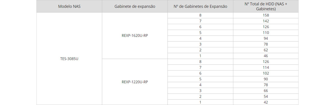 Para aumentar a expansão de armazenamento do sistema, o TES-3085U possui suporte para Virtual JBOD, assim outras unidades NAS podem ser usadas para elevar a capacidade.