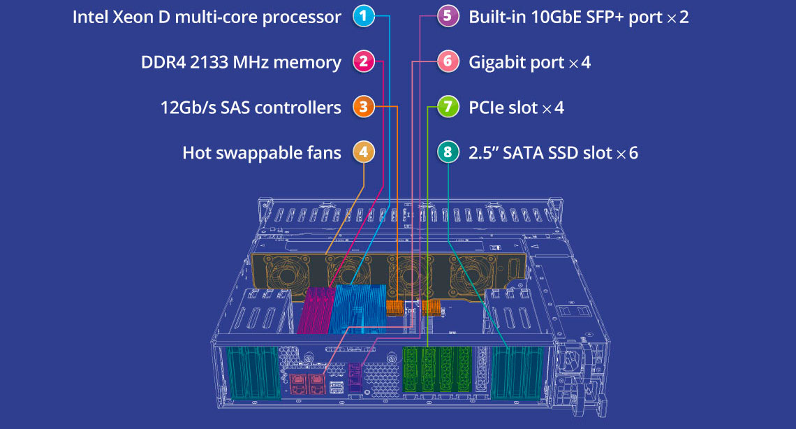 8- 6 slots SATA SSD 2,5 polegadas, para caching, pool de armazenamento de alta velocidade ou para drives OS QES.