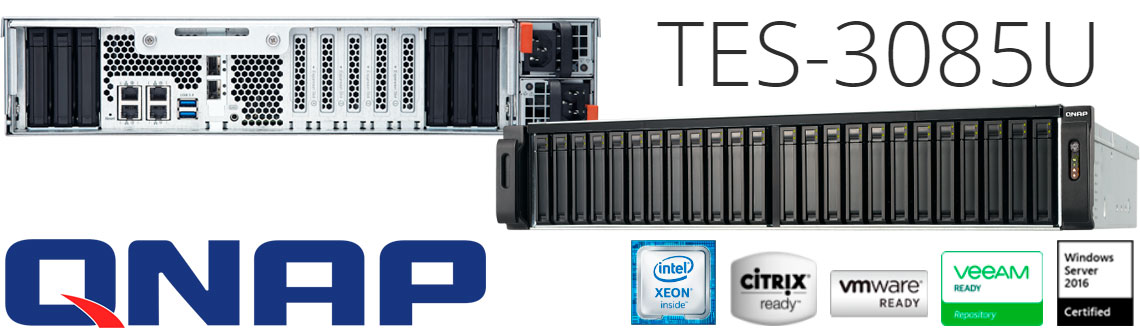 o TES-3085U disponibiliza 24 baias para hard disks SAS/SSD e SATA e hot swappable. Equipado com um processador SoC Intel Xeon D 64bits com PCH integrado, até 128GB DDR4 ECC RDIMM RAM / 64GB DDR4 non-ECC UDIMM RAM de memória, conexão SAS de 12GB/s e 2 entradas 10GbE SFP+.