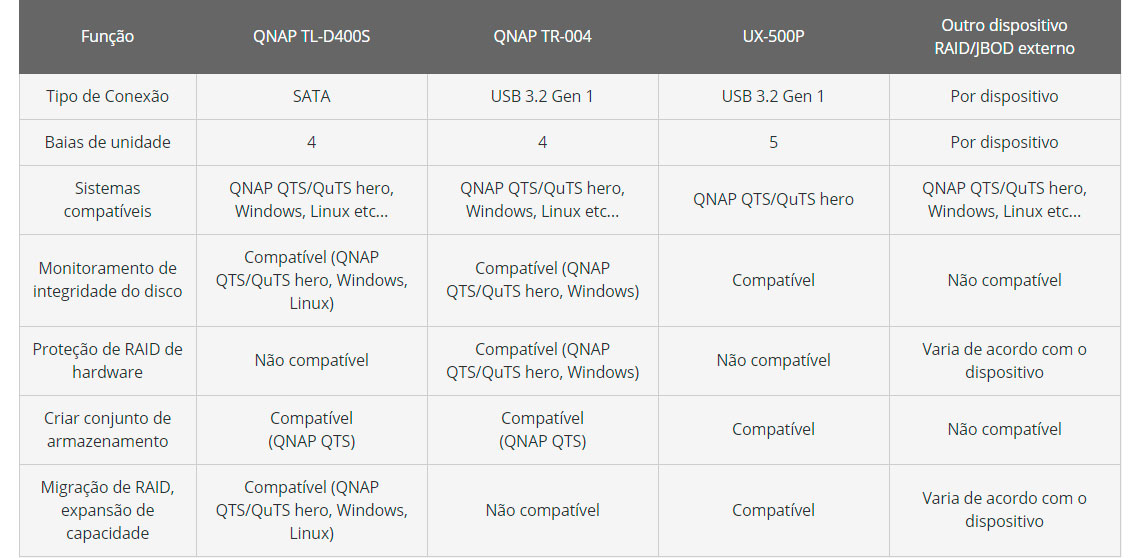 QTS / QTS hero | QTS hero 4.4.2 / QTS h4.5.0 (ou mais recente) Monitoramento da unidade QTS e suporte ao pool de armazenamento Recursos avançados da unidade QTS, como verificação de bloco incorreto, apagamento, teste de desempenho, Seagate Ironwolf IHM RAID migrado e expandido Qtier no Gabinete |