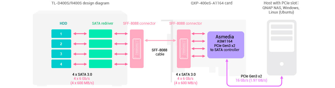 Instale uma placa PCIe QXP nos NAS da Qnap, servidores e PCs, Windows ou Ubuntu, para conectar o storage usando o cabo SFF-8088 (ou SFF-8644) para uma fácil expansão de armazenamento.