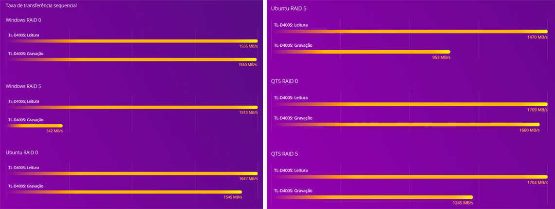 Protege-se os dados criando um volume de RAID 0, RAID 1 e RAID 5 de software com utilitário nativo das máquinas Windows e Ubuntu e usar o Qnap JBOD Manager para monitorar o status do TL-D400S.