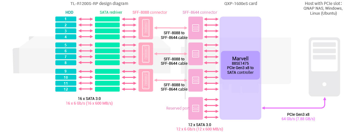 Instale uma placa PCIe QXP nos sistemas Qnap NAS, servidores e PCs Windows ou Ubuntu para conectar o gabinete de expansão usando o cabo SFF-8088 (ou SFF-8644) para uma fácil expansão de armazenamento.