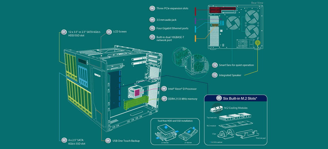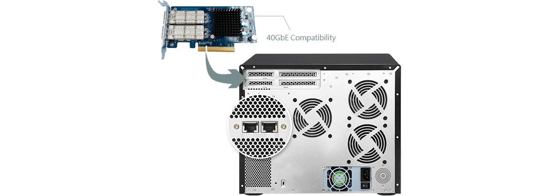 Com características encontradas normalmente em storages em rack, pode ser integrado com adaptadores para conexões 10GbE e 40GbE, fazendo dele um desktop NAS capaz de realizar tarefas de virtualização, servidores de aplicação, iSCSi, backup, recuperação de desastres e muito mais.