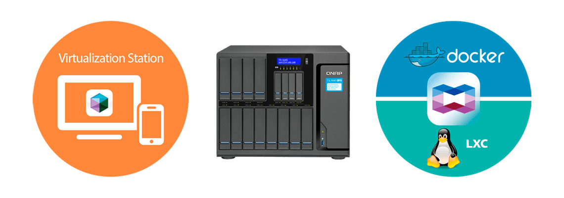 O TS-1685 ainda possui o Container Stations, com integração para tecnologias de virtualização LXC e Docker lightweight. É possível operar múltiplos sistemas Linux isolados no storage, assim como baixar aplicativos através do Docker Hub Registry.