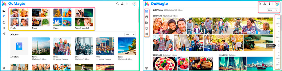 O QuMagie engloba tecnologia de reconhecimento de imagem QuMagie Core AI para reconhecimento facial, identificação de pessoas e geográfica. Fotos semelhantes são categorizadas em álbuns.