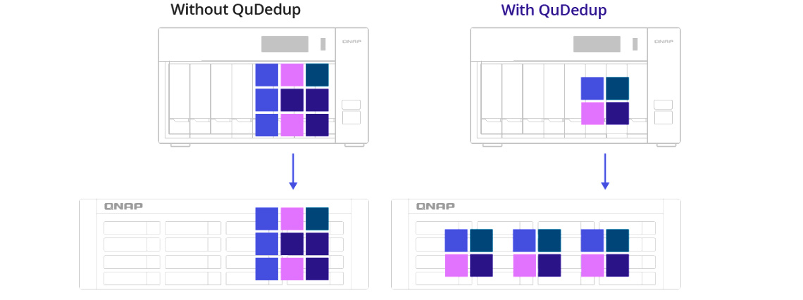 Compatível com a tecnologia QuDedup, que elimina dados duplicados na fonte, acelerando tarefas de backup futuras e restauração via conexões 2,5GbE.