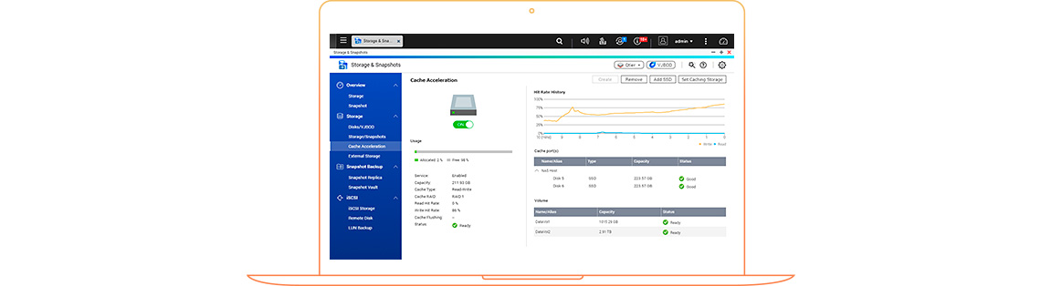 Aceleração de cache SSD: Habilite o cache SSD para reforçar o desempenho de IOPS e reduzir a latência do volume de armazenamento. Este recurso é ideal para aplicações com alto consumo de IOPS, incluindo bancos de dados e virtualização. O NAS 2 baias também suporta o cache somente gravação para otimizar aplicações com gravação intensiva.