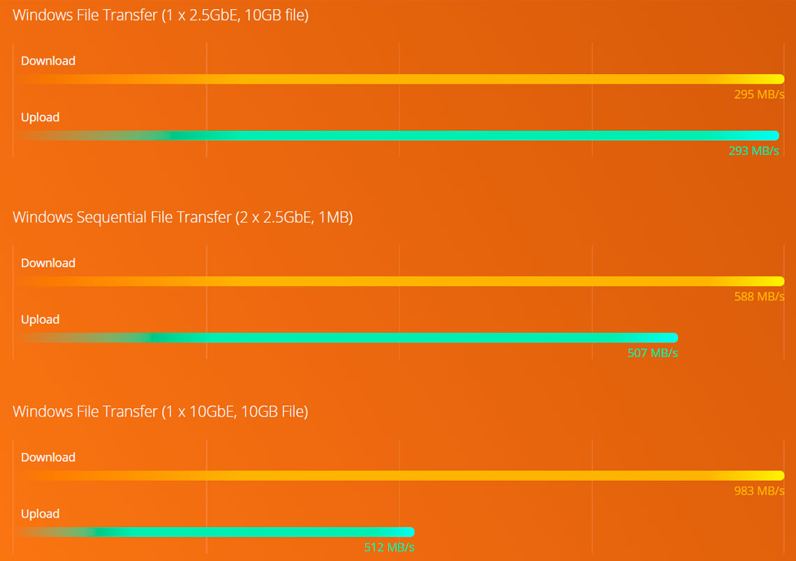 O TS-253D disponibiliza 2 portas LAN RJ45 2,5GbE que possibilitam utilizar cabos CAT5e existentes para aumentar a velocidade de rede de 1 Gigabit para 2,5 Gigabits.