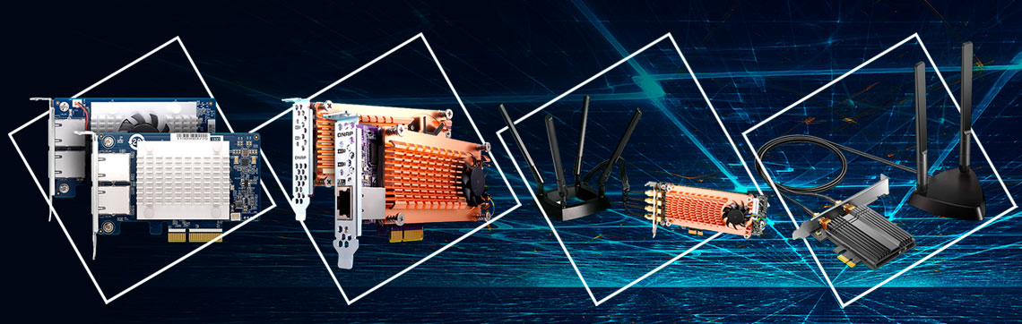 Para otimizar o desempenho, instale uma placa QM2 da QNAP para ter cache SSD M.2 ou conectividade 10GbE. É possível também usar uma placa de rede Wi-Fi 6 (802.11AX) para criar um ambiente de rede sem fio e integrado.