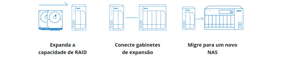 A QNAP oferece soluções fáceis de expansão da capacidade de armazenamento. Estas são várias maneiras de expandir o armazenamento do storage conforme necessário para acompanhar o crescimento dos dados e dos negócios.