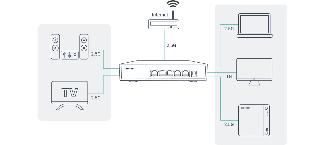 A conectividade 2,5GbE traz grandes avanços em relação ao padrão 1GbE. O QSW-1105-5T é um switch não gerenciável com 5 portas 2,5GbE (compatibilidade retroativa com 1 G/100 M) e pode ser ligado a vários computadores e sistemas NAS com cabos CAT5e.