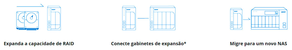 A Qnap oferece soluções fáceis de expansão da capacidade de armazenamento. Para expandir o NAS 4 baias e acomodar o crescimento de seus dados é possível atualizar a capacidade RAID trocando as unidades de baixa capacidade por outras de maior capacidade, anexar gabinetes de expansão (JBOD) utilizando o QTS Storage & Snapshots Manager para gerenciá-los ou migrar para um novo NAS instalando seus discos rígidos em um storage maior.